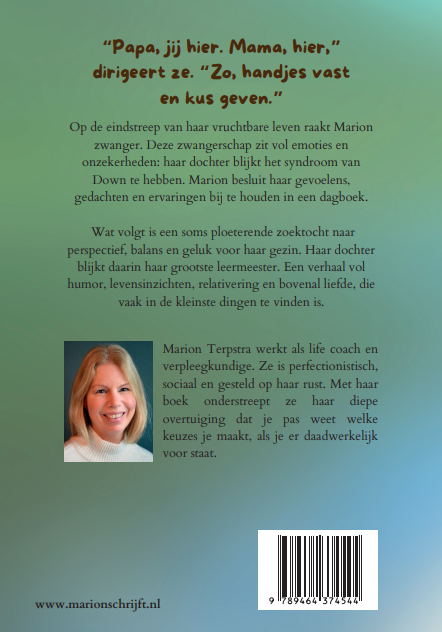 Op de eindstreep van mijn vruchtbare leven raak ik zwanger. Deze zwangerschap zit vol emoties en onzekerheden: onze dochter blijkt het syndroom van Down te hebben. Wat volgt is een soms ploeterende zoektocht naar perspectief, balans en geluk voor ons gezin. Een verhaal vol humor, levensinzichten, relativering en bovenal liefde, die vaak in de kleinste dingen te vinden is”.